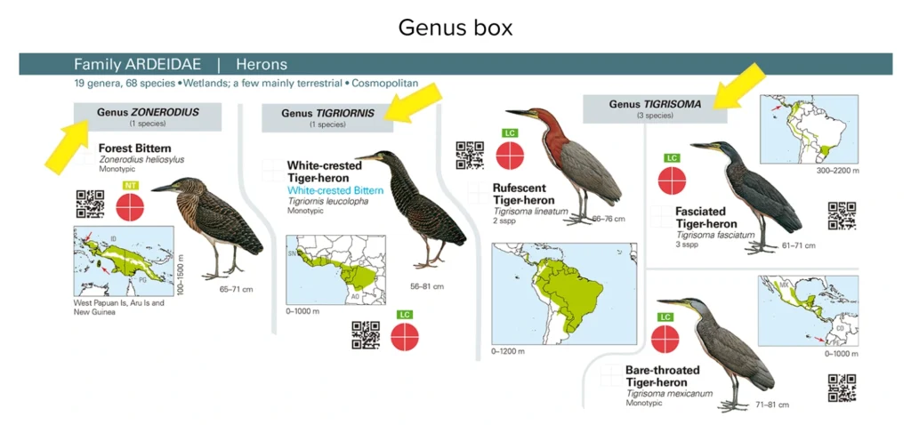 All the Birds of the World has a number of interesting features that are not found in the HBW and BirdLife International Illustrated Checklist of the Birds of the World. One is that it presents a species-by-species comparison of the taxonomic treatment by the four major world checklists that classify all the birds of the world: those by HBW and BirdLife, eBird/Clements, the IOC and Howard and Moore. We think that this straightforward, visual comparison will be useful for readers with an interest in taxonomic matters, and we also hope it will serve as a tool to advance the ongoing process of reconciling the different taxonomies in one unified list. This unification would have important benefits for everyone needing a solid bird list—not just ornithologists and birdwatchers, but also governments, wildlife managers, ecologists, conservationists and many others. All the Birds of the World includes every taxon accepted as a species by any of these four major world lists, which is how we arrive at the total of 11,524 species covered.