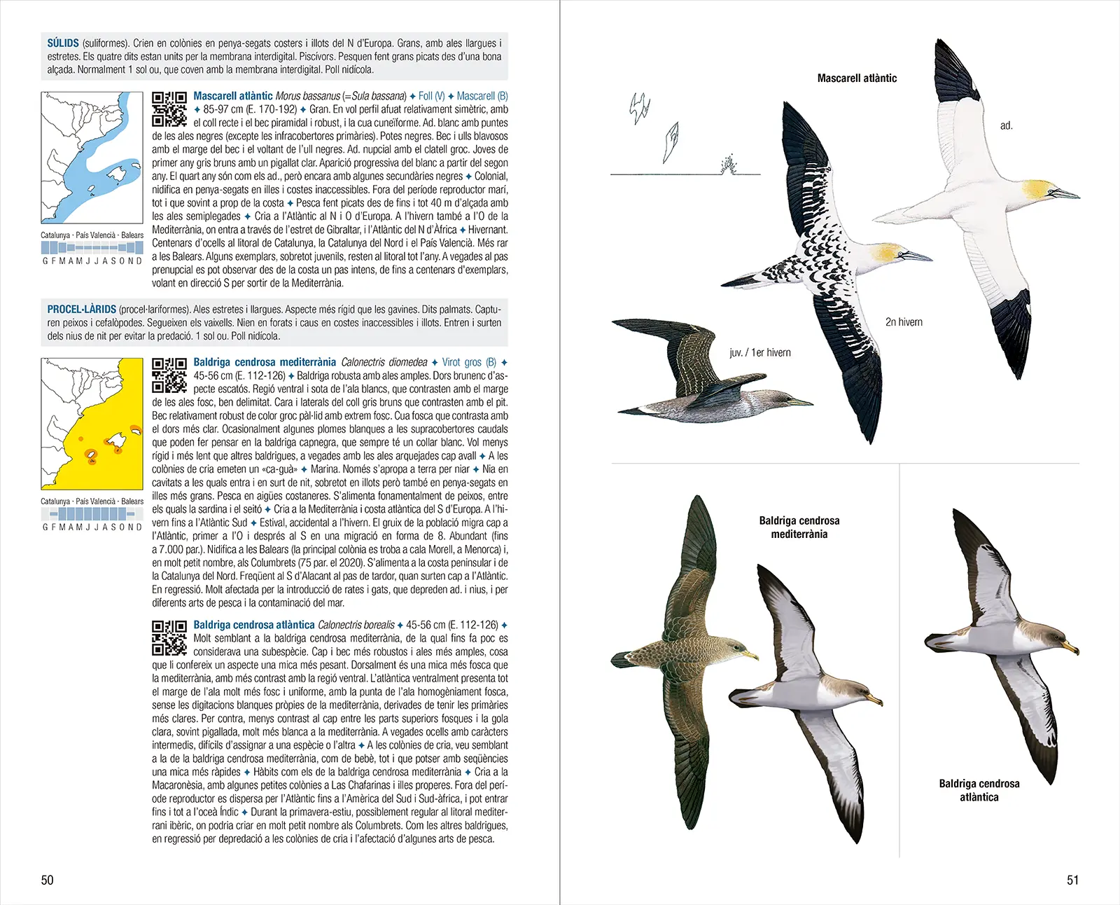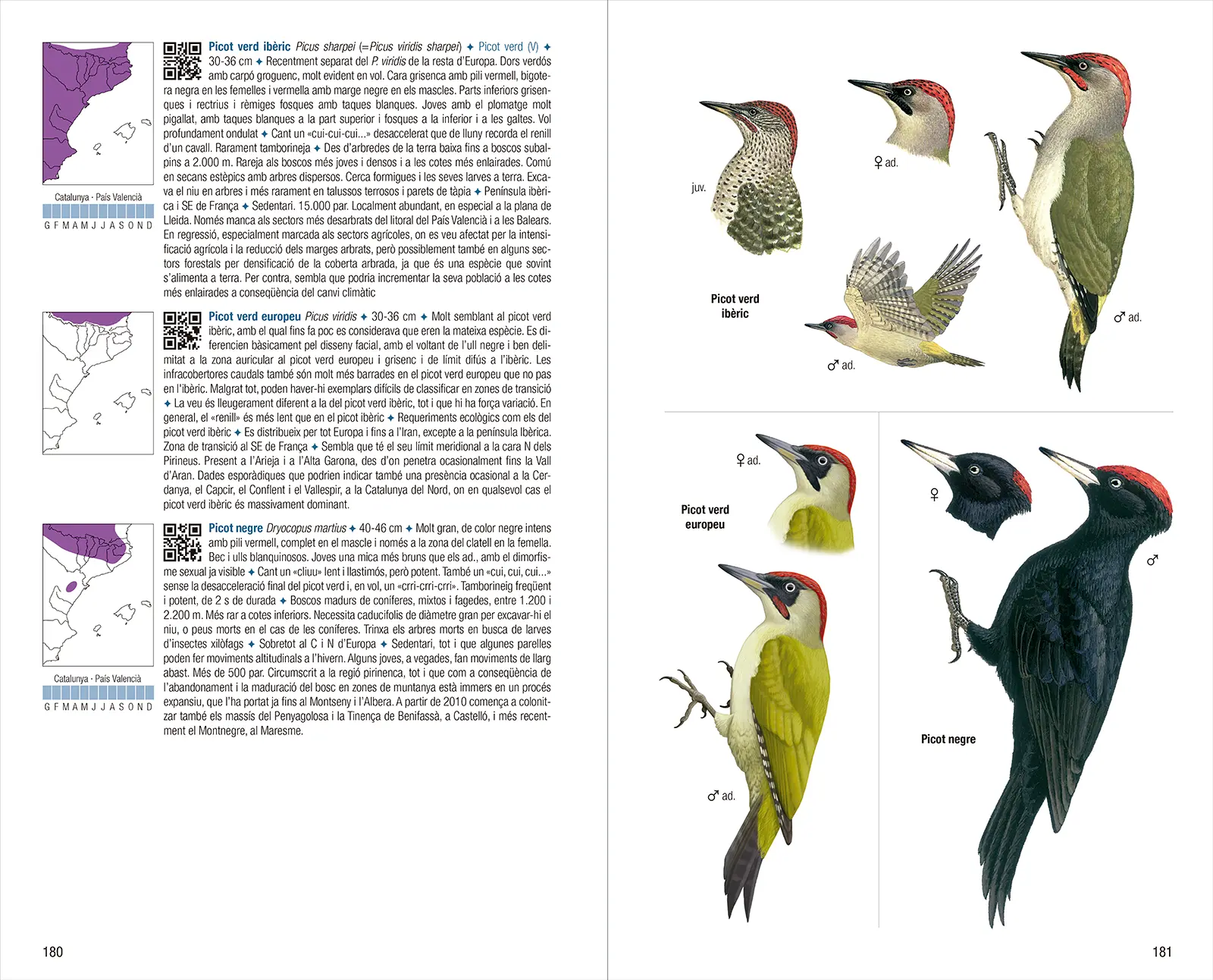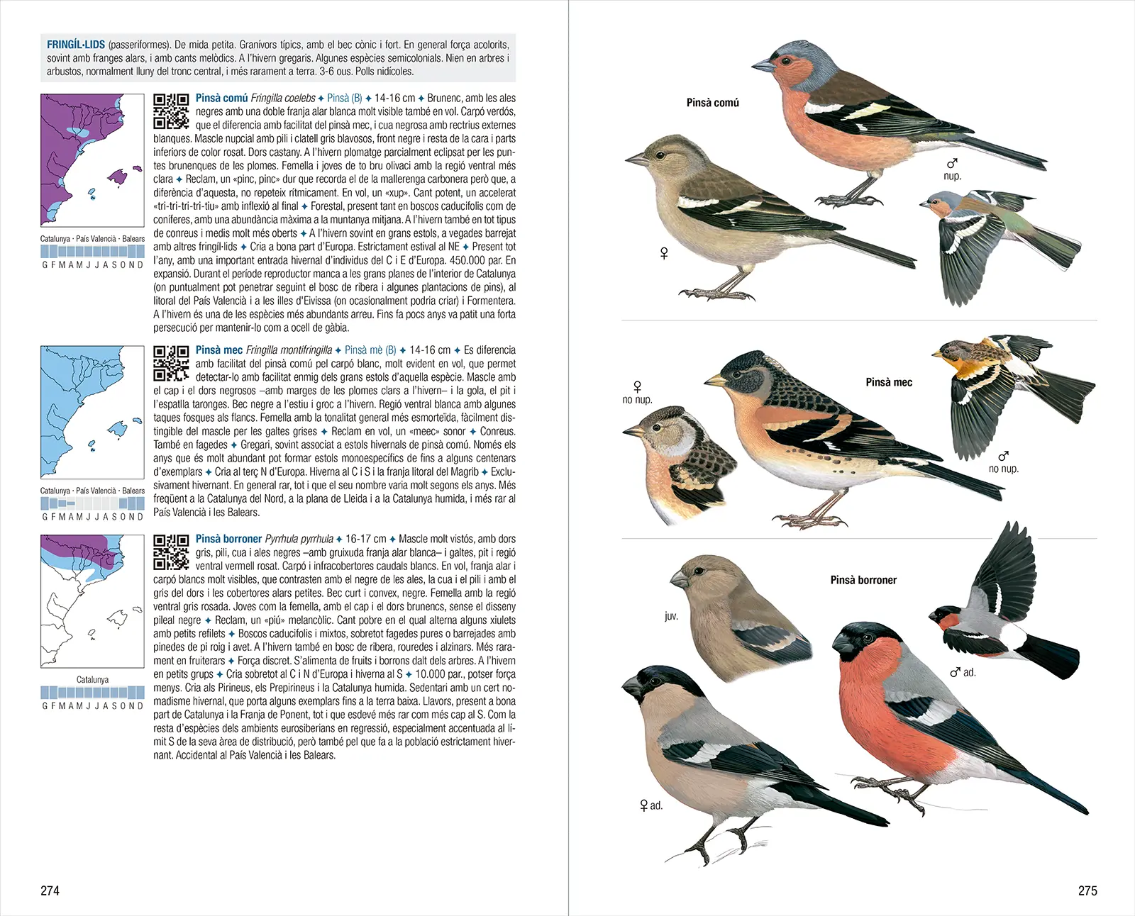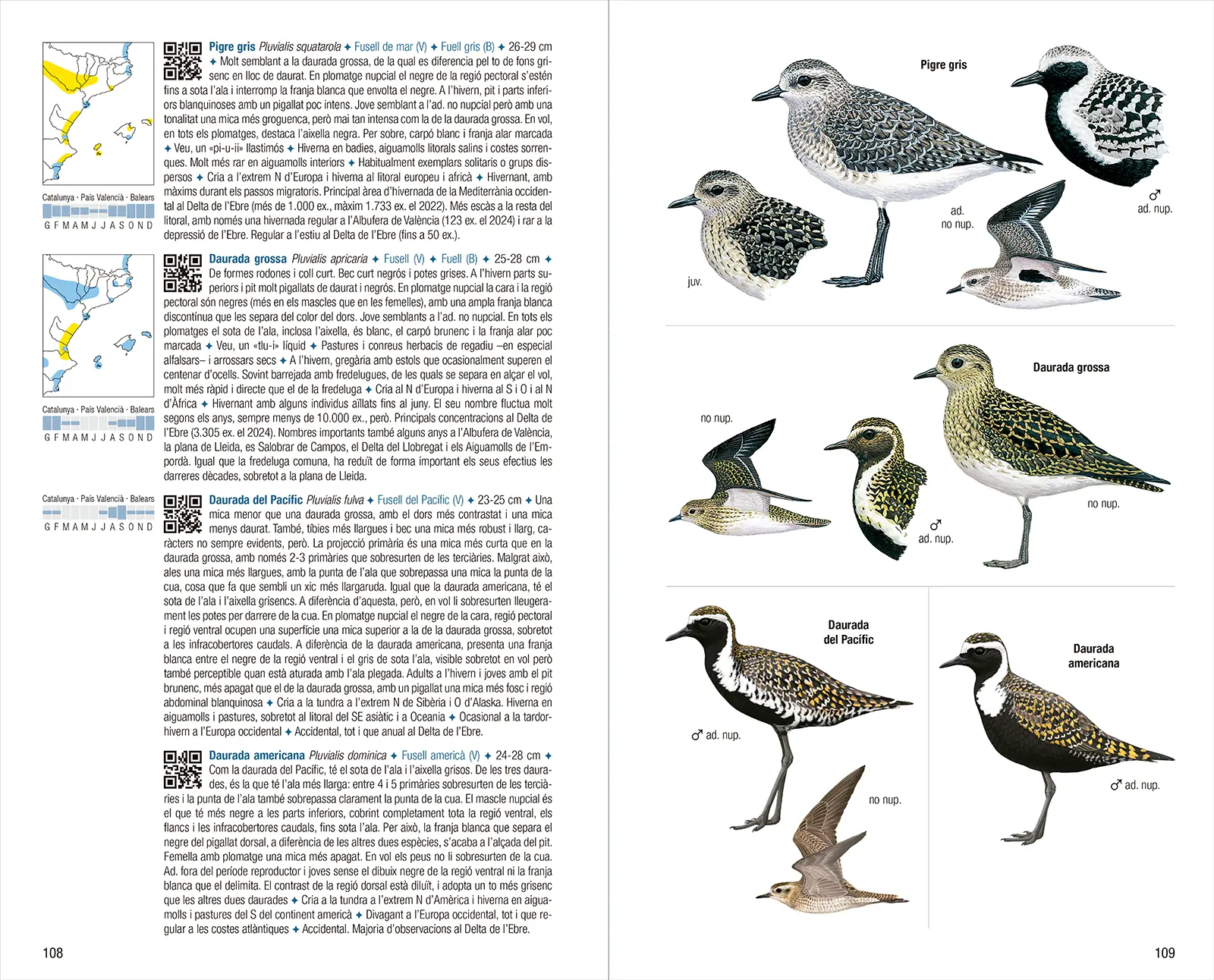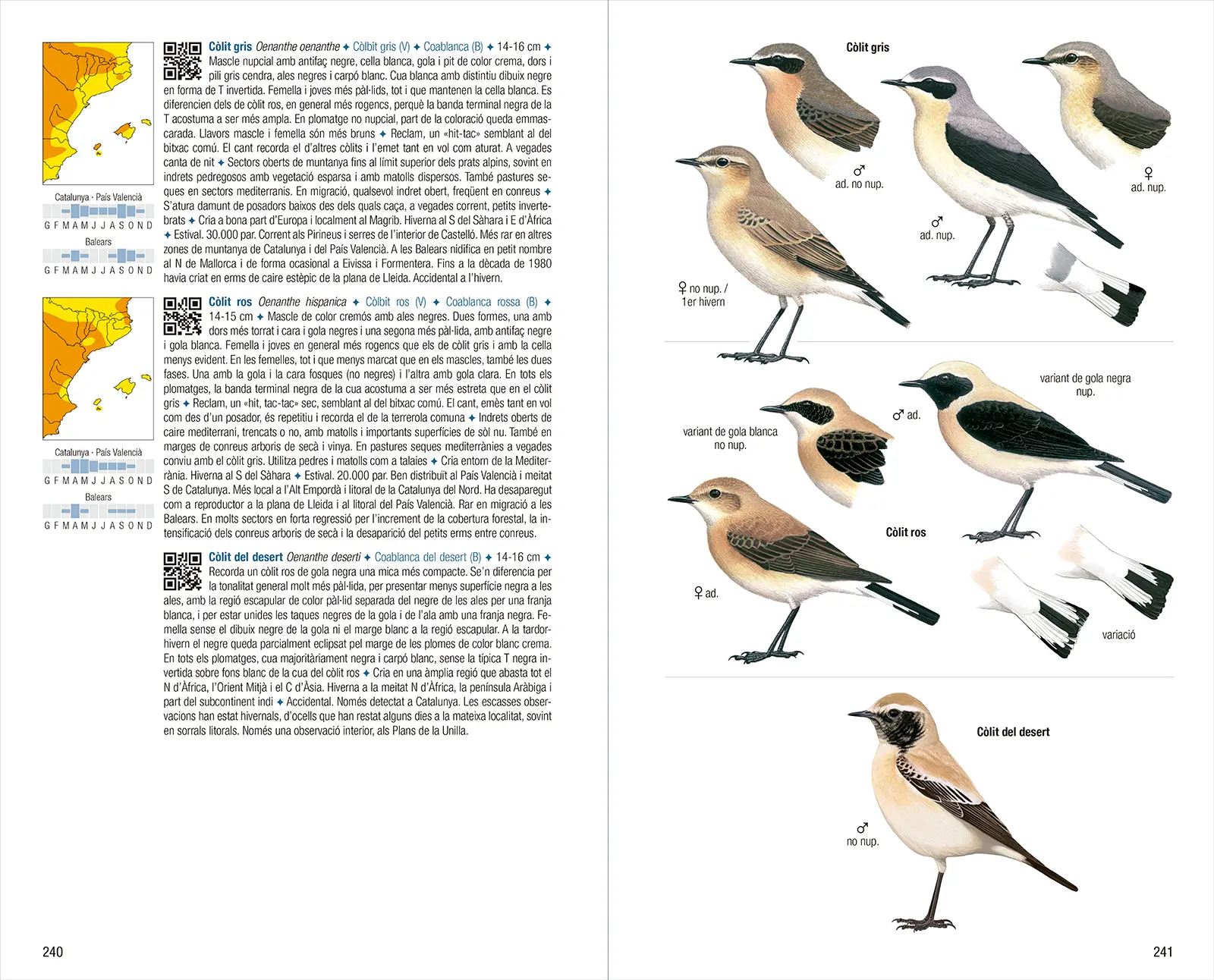 文字介绍内容包括:加泰罗尼亚语名称与科学名称(若瓦伦西亚自治区或巴利阿里群岛使用的名称不同,亦予以标注)、体型大小、与相似物种羽衣的区别、鸣声、生态需求、行为特征、在西部古北界及本书覆盖区域内的分布情况,以及种群规模与趋势。